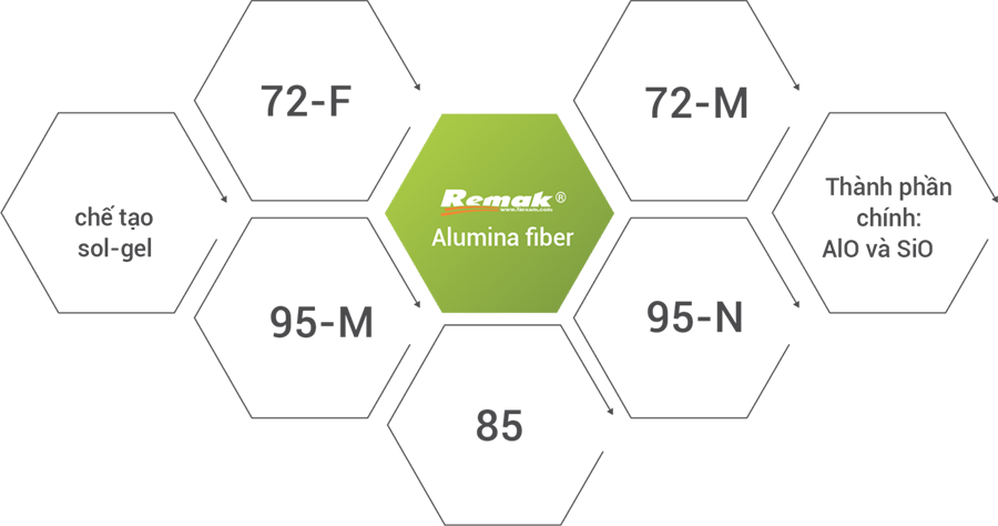 Các sản phẩm bông gốm Alumina hiện được phân loại theo tỷ lệ thành phần Al₂O₃ – SiO₂ thành 5 dòng chính: 72-F, 72-M, 85, 95-N, 95-M.